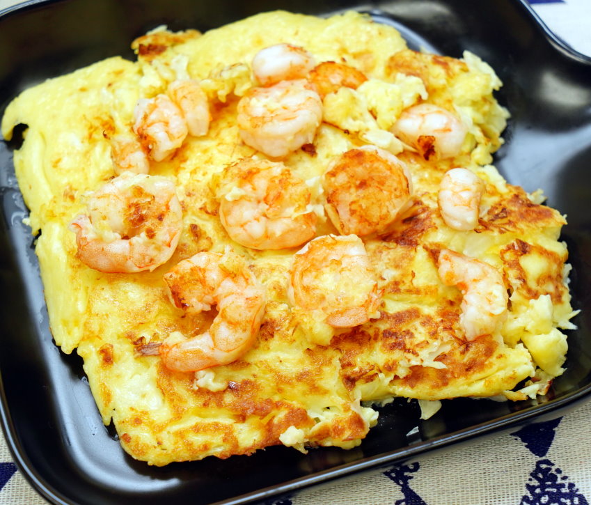 4.海鮮版本也差不多,將蝦仁洗淨後一半切成小塊,混入麵糊中一起下去香煎,原塊蝦仁可另外煎熟備用。