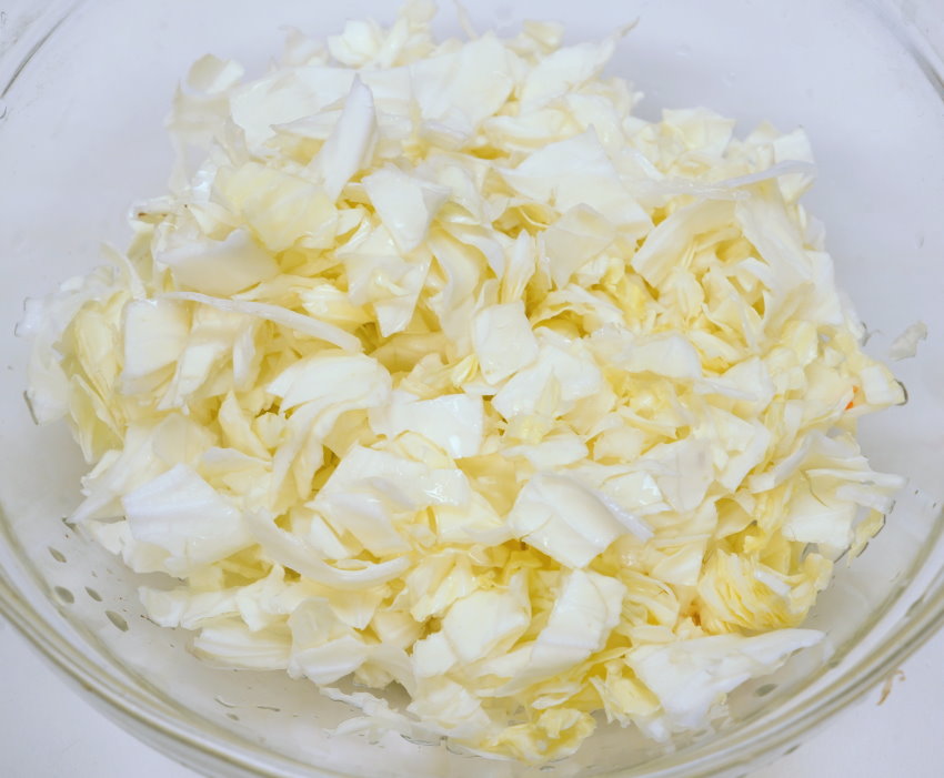 ▼高麗菜洗淨後瀝乾切成碎片,我們這次是用了1/8顆左右,想要多一點或少一點都無妨!