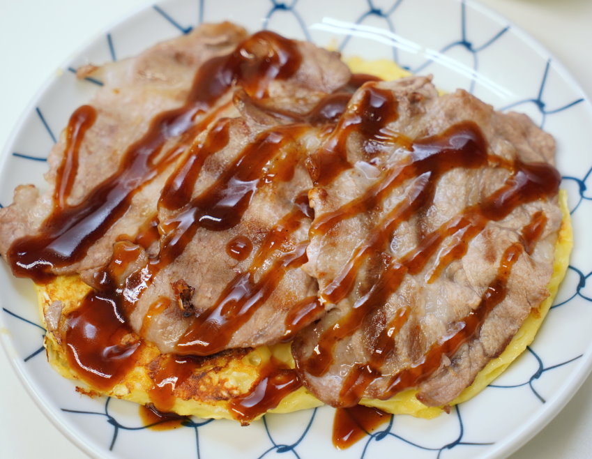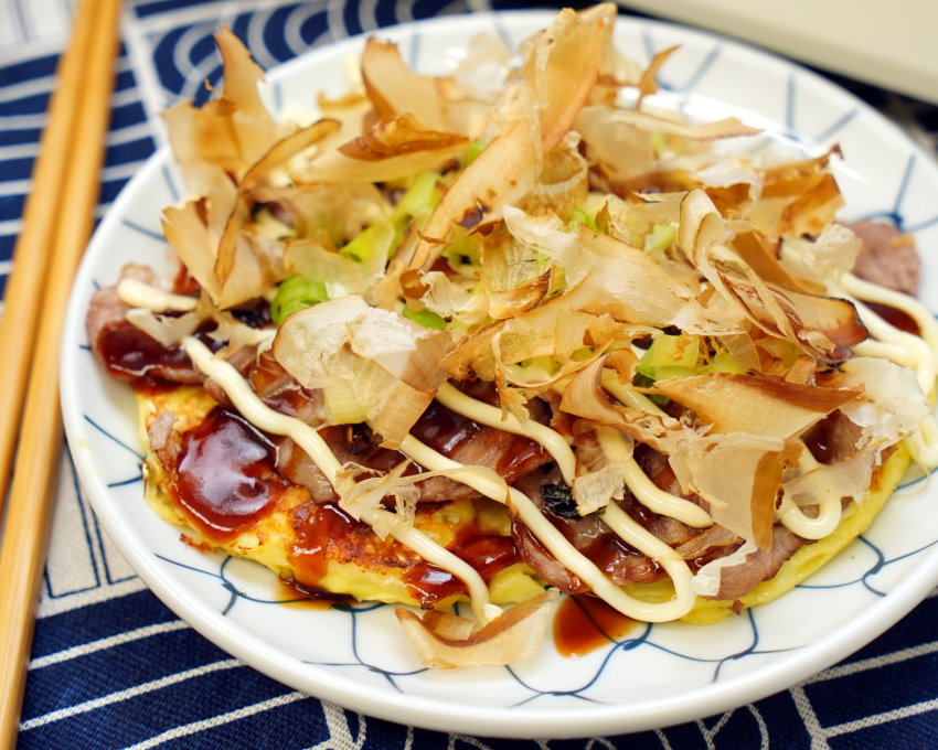 3.將豬肉片放在煎好的麵糊上頭,淋上大阪燒醬(或是將山葵醬跟大阪燒醬混合再加入)、日式美乃滋,再加上海苔碎、蔥花、柴魚片就完成了。