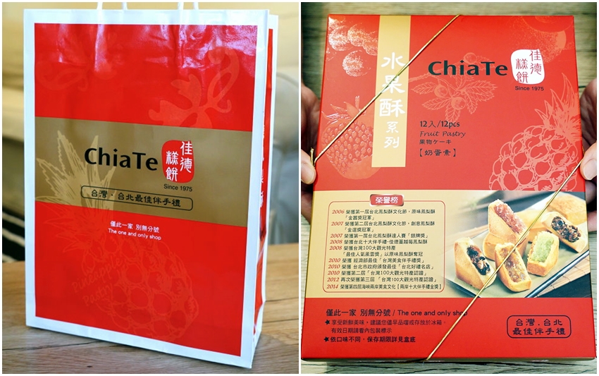 ▼「佳德糕餅」的外盒採用紅色系搭配多種水果為素材,下方還有一整排的榮譽榜,光看就覺得很厲害的樣子~~外提袋為經典的紅金色系搭配,喜氣又大方,不管是送禮或自己享用都很適合!
