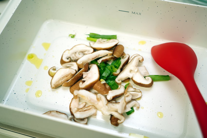 ▼在深湯鍋中加入少許油,再放蔥段、香菇下去炒香~~使用Giaretti 珈樂堤多功能陶瓷不挑鍋料理盤的好處就是可以一鍋到底,真的很方便!如果家裡沒有料理盤的朋友也可以用一般平底鍋來炒唷~~