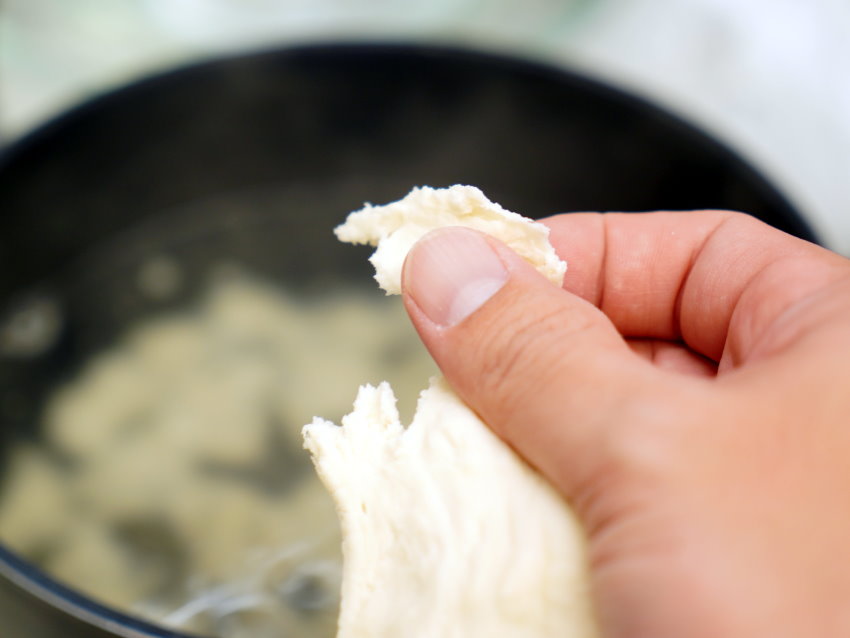 2.另外煮一鍋滾水備用,將麵糰拿出揉壓將空氣排出,揉成光滑面後即可切成厚片狀再切一半,再捏成薄片小塊狀即可丟入滾水中,煮至麵疙瘩浮起就可撈起!