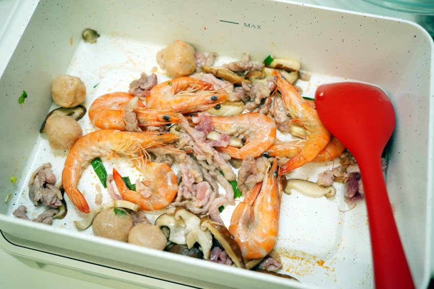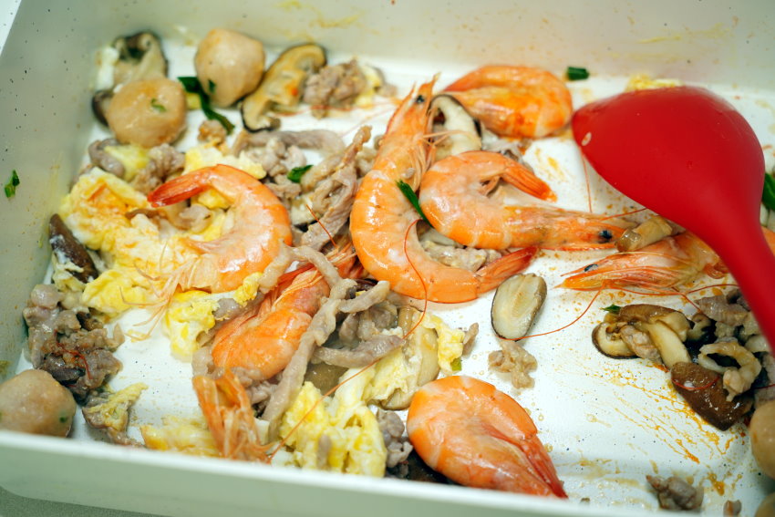▼接著放入肉絲、蝦子、魚丸等配料下去炒~~