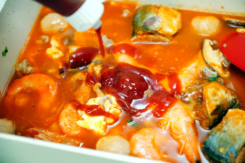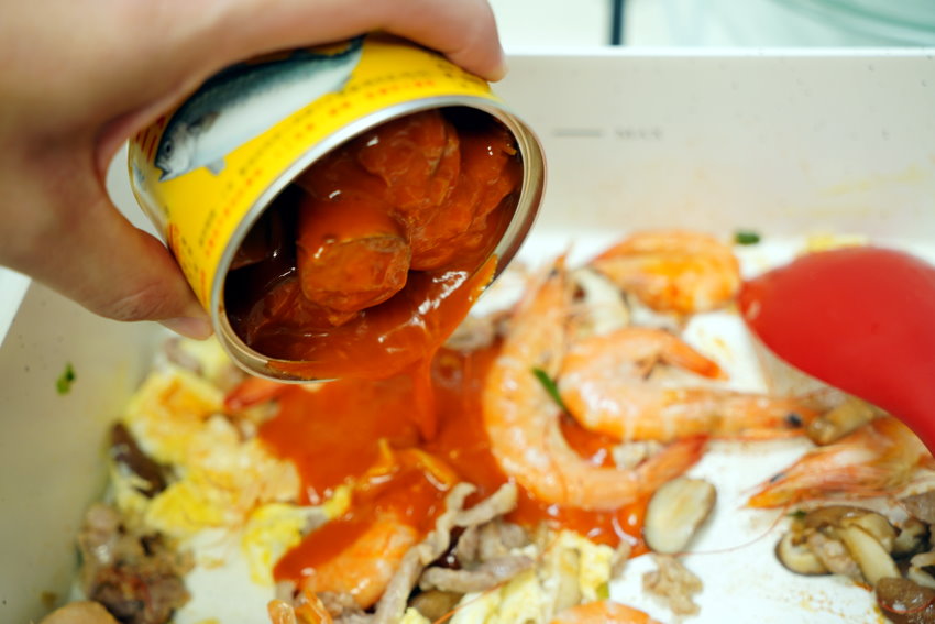 ▼整罐茄汁鯖魚罐頭通通給它倒下去~~
