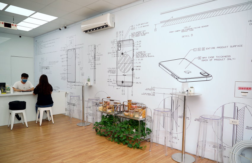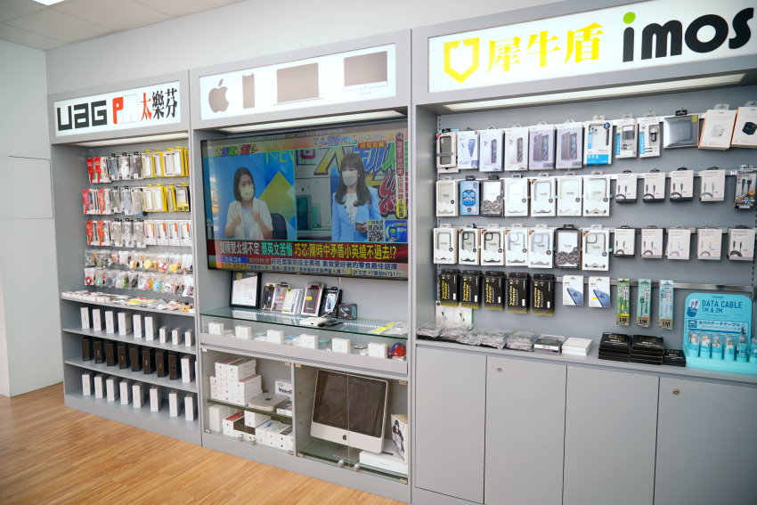 ▼一旁也有配件區,有各式各樣的蘋果周邊產品、配件等,主要也是以保護功能為主;中間還有提供電視,讓大家等待手機維修、沒手機滑也不至於太無聊,真的是很貼心啊!