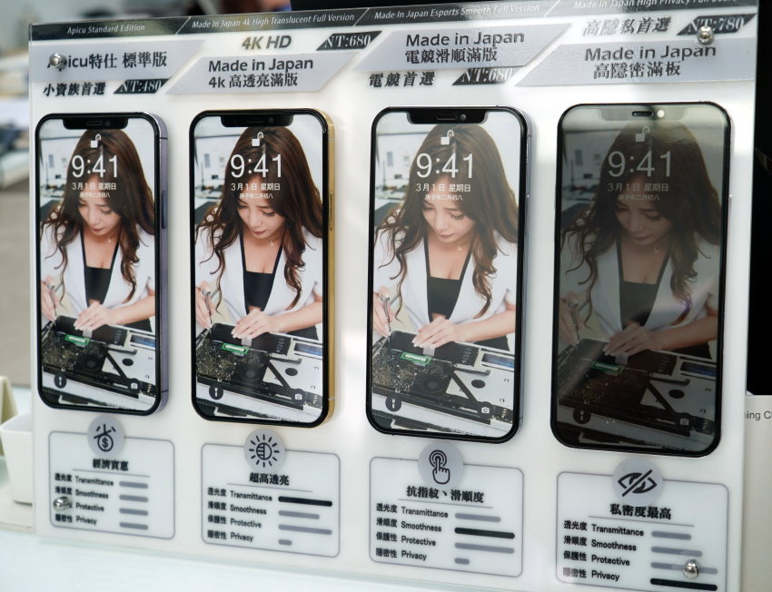 ▼店內有提供iPhone全系列保護貼,包括標準版、高透亮滿版、滑順防指紋霧面滿版、保護隱私防窺滿版四種,都是嚴選日本高規格玻璃品牌AGC旭硝子玻璃,高強度更能完整保護螢幕,不會一摔就碎!