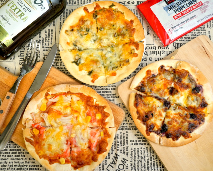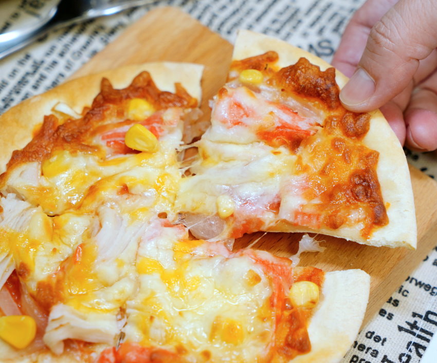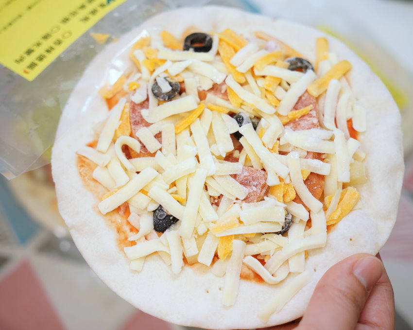 ▼披薩上頭都已經加好配料與乳酪絲,直接拿進去烤箱、氣炸加熱即可!