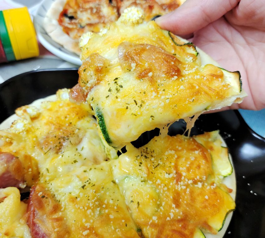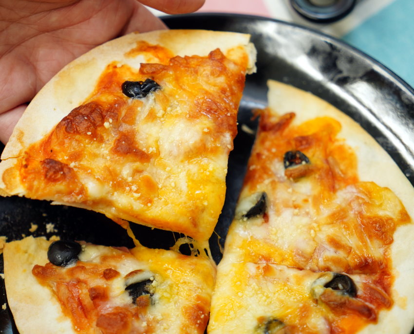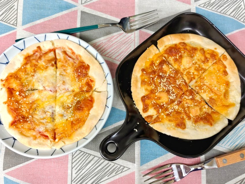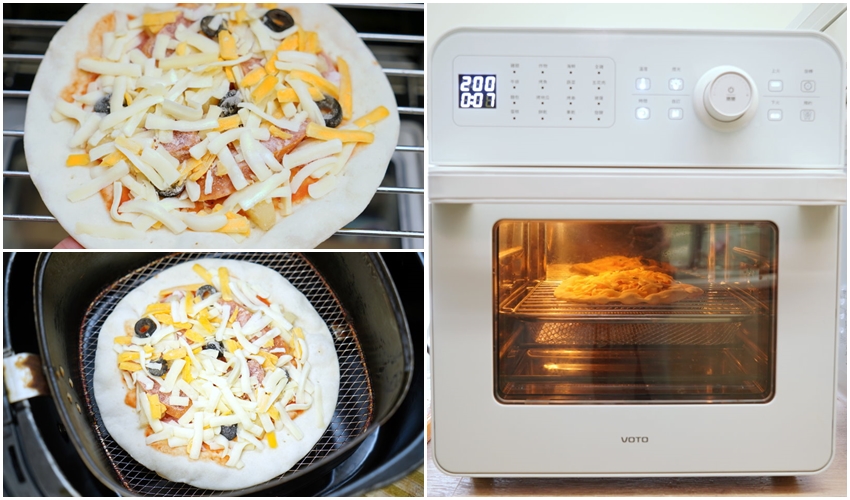 ▼一般家用烤箱可以先預熱3分鐘,再放進去烤7~10分鐘,烤至披薩上色、乳酪絲融化即可;用氣炸鍋的朋友可以直接設定200度5分鐘,像我們一樣用氣炸烤箱的話可以設定200度7分鐘,大家也可以視各家廠牌與效能來調整溫度、時間唷!