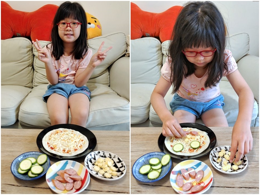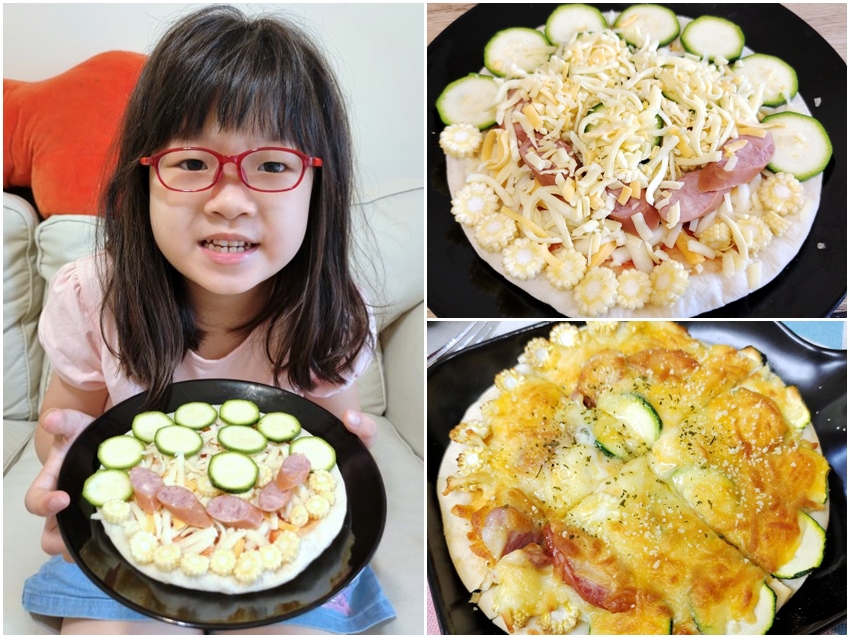 ▼我們簡單準備了櫛瓜、起司德國香腸、玉米筍等配料,讓小口愛做出自己喜愛的圖樣~~據小口愛本人說她做的是一張微笑的臉蛋(?)可惜撒上乳酪絲之後就更看不出來了(笑)!不過沒關係~~重點是好吃就好,小朋友也會很有成就感喔!