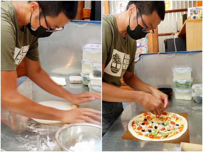 ▼披薩都是老闆現擀現做,擀好餅皮後,再塗上醬料、配料也是整個放好放滿,純手工製作就是讚!