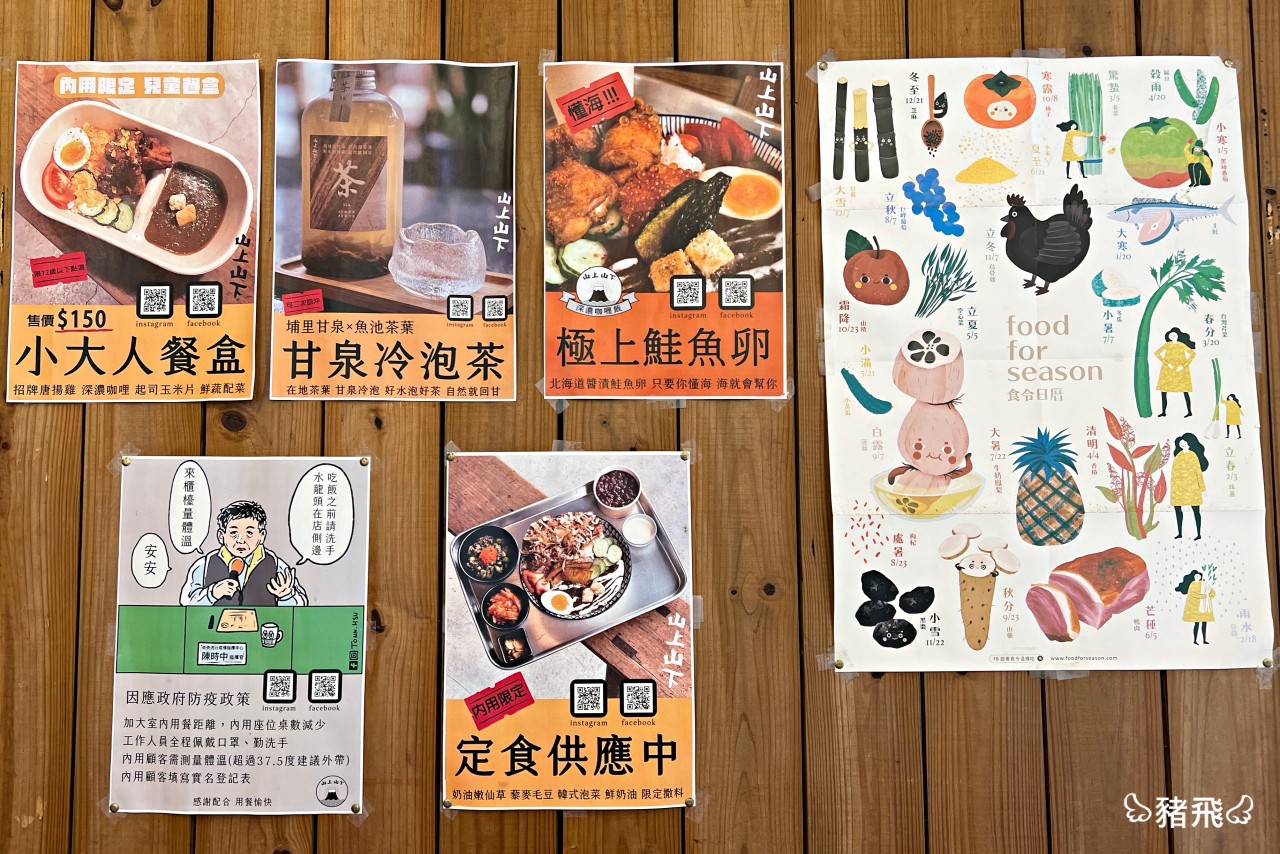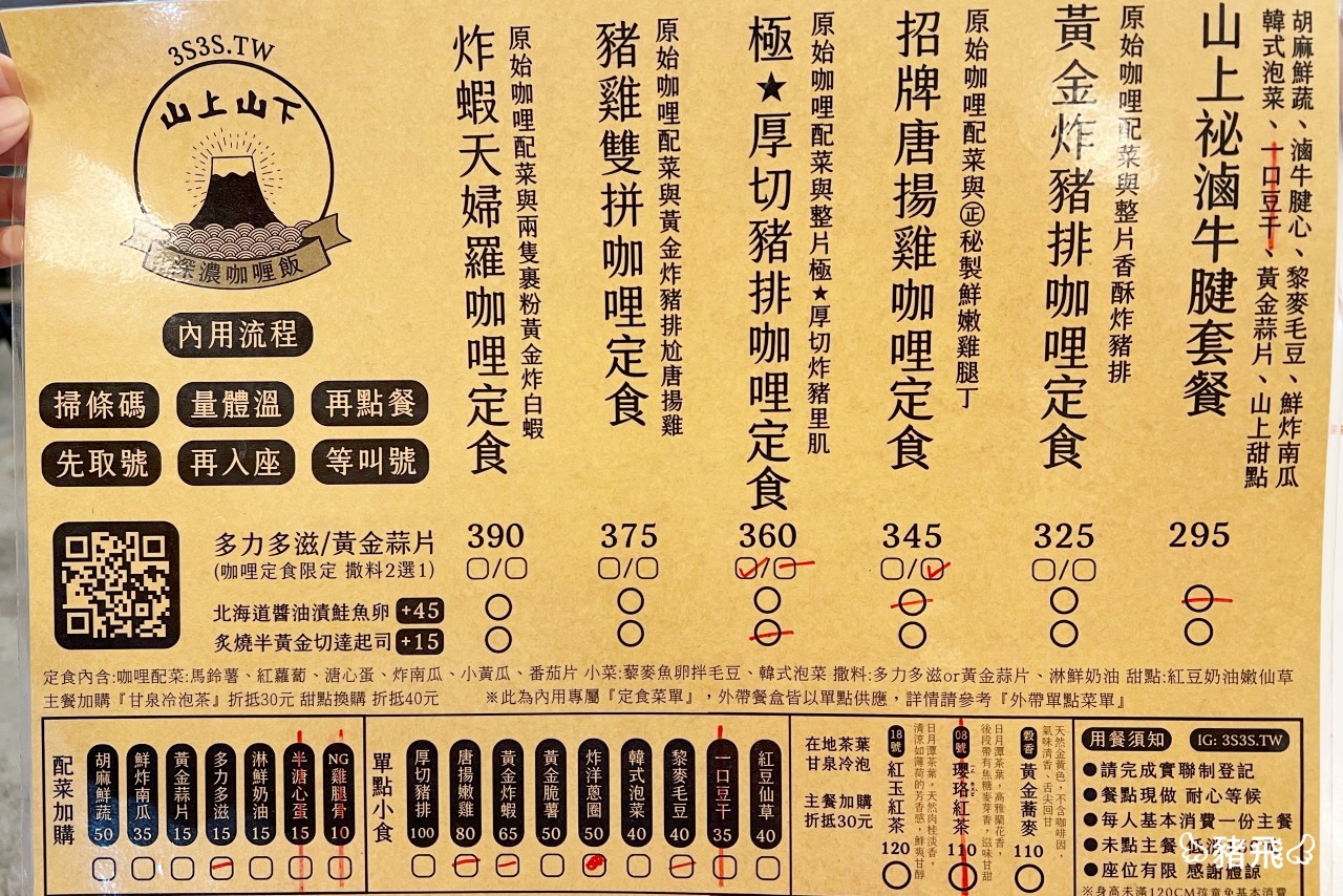 「山上山下咖哩飯專賣店」販售的餐點很簡單,以自家熬煮的濃厚系咖哩為主要靈魂,提供六種咖哩定食,價格295~390元。定食的內容有:溏心蛋、蔬菜、小菜、撒料及甜點。主餐口味有滷牛腱、黃金炸豬排、招牌唐揚雞、厚切豬排、豬雞雙拼、炸蝦天婦羅,口味都各自的支持者,實在是很難決定吃什麼啊。
