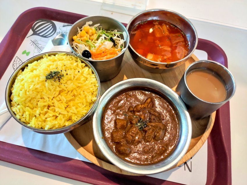 ▼香料羊腩,附餐選的是薑黃飯,另外再單點蔬菜沙拉、公司湯、印度奶茶等,就是一個豐富的套餐啦!香料羊腩吃起來帶點微辣的味蕾,搭配濃郁的香料香氣與柔嫩的口感,整個很下飯啊~~
