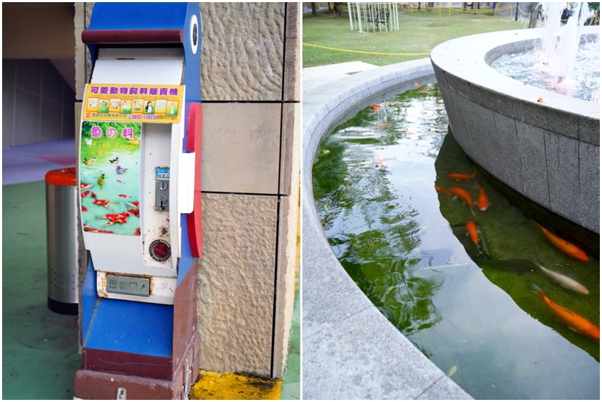 ▼噴水池旁有不少鯉魚在游泳,一旁也有飼料販賣機,帶小朋友來的朋友也可以來餵餵魚!
