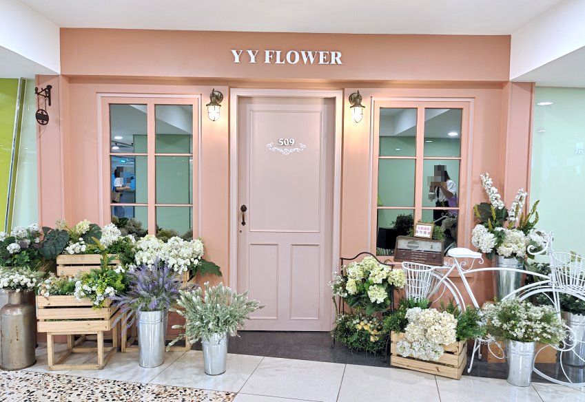 ▼除了中庭有超好拍的裝置藝術之外,一樓香氛區後方、靠近電梯門廳處還有兩個隱藏版秘境打卡點,門牌上的501及509都是大江的地址門牌號碼,連細節都隱藏小巧思~~也吸引不少朋友特地前來拍網美照,像這面的主題就是花店,粉嫩色系搭配多彩的花卉擺飾,怎麼拍都很少女啊!