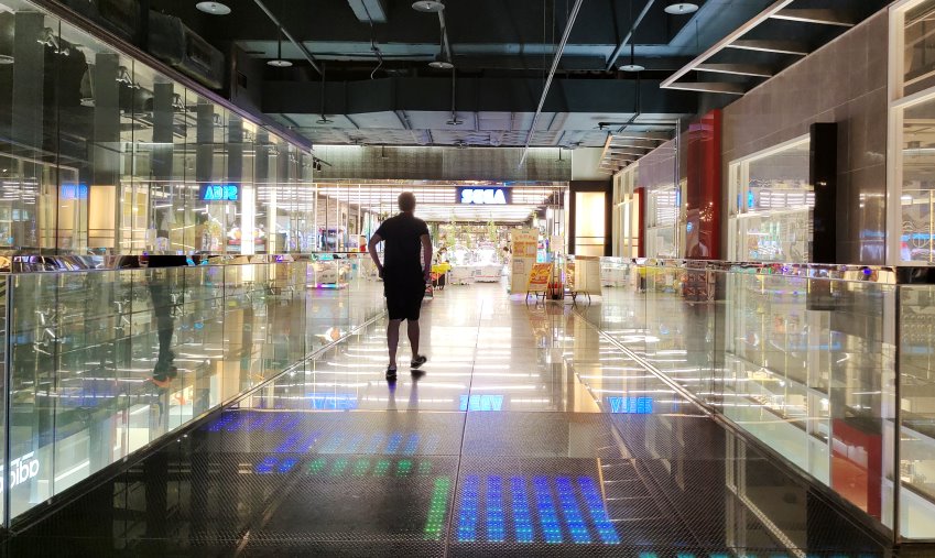 ▼一旁SEGA LED門口的幻彩空橋,繽紛又多變,走在上頭感覺超有科技感啊!