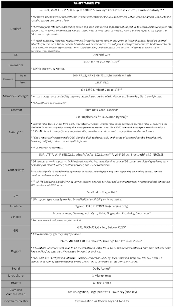 根據 Evan Blass 曝光的規格,雖然還未指出三星最新一代三防手機 Galaxy XCover 6 Pro 的處理器型號為何,但已然可知 Galaxy XCover 6 Pro 會使用 6.6 吋 20:9 FHD+ 螢幕,支援 120Hz 螢幕更新率、500 萬畫素主鏡頭 + 800 萬畫素廣角鏡頭,以及 1,300 萬畫素的前鏡頭,6+128GB 組合配置,以及 4050mAh 電池容量,支援 IP68、人臉辨識、側邊按鍵指紋辨識。
