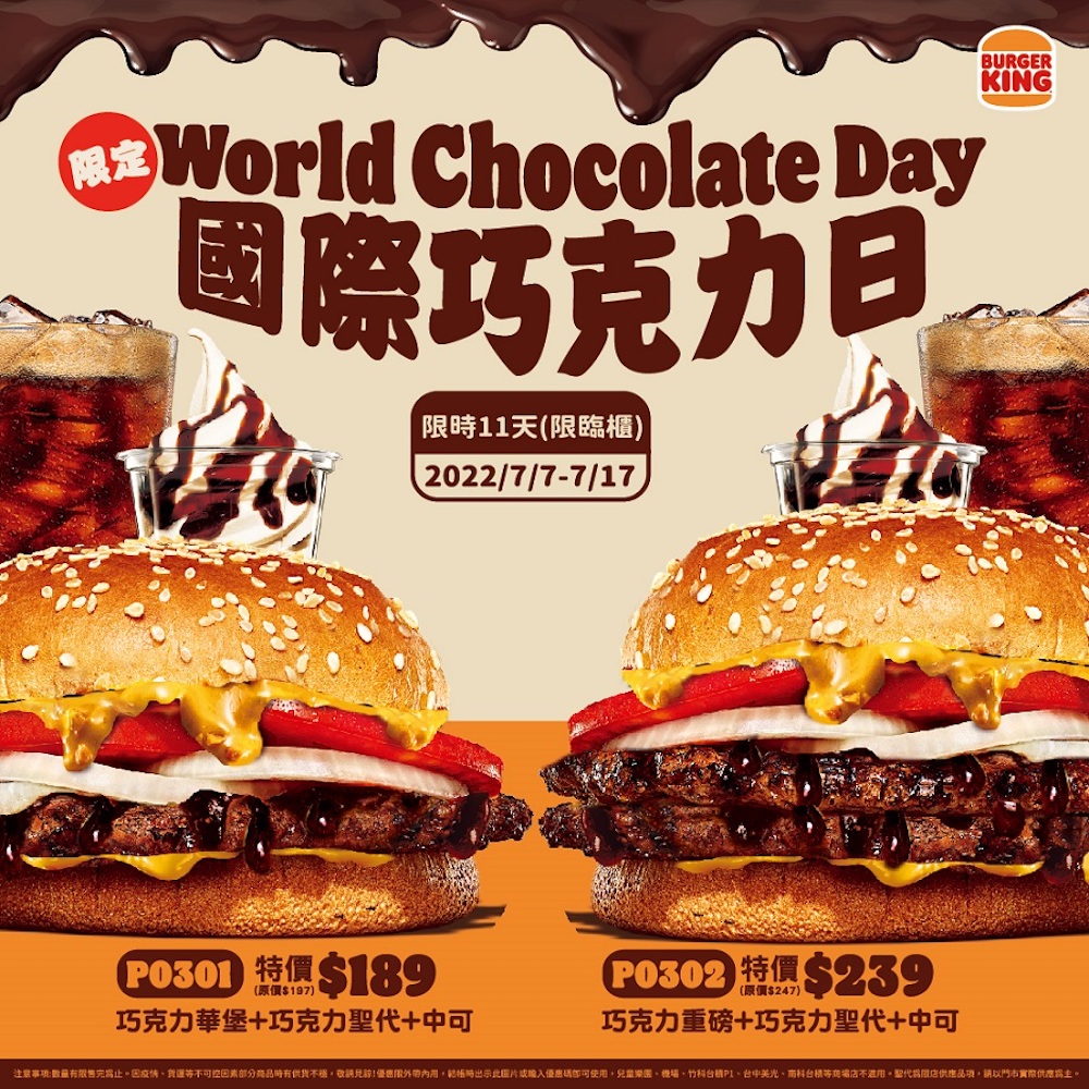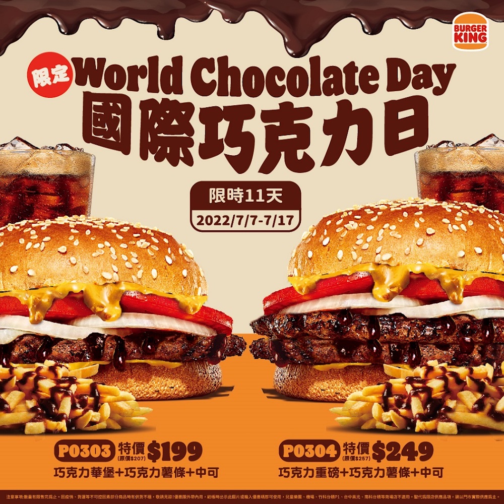 並且漢堡王表示為了歡喜迎接國際巧克力日,將自 7 月 7 日至 7 月 17 日,推出限時 11 天瘋狂登場,首度全台限期甜蜜上市,僅在火烤專賣店販售的巧克力華堡,並加碼推出全新的巧克力薯條與巧克力聖代!其中,巧克力系列套餐搭配巧克力薯條與中杯百事可樂,只要 199 元起;喜歡聖代的朋友,可至漢堡王聖代販售店購買巧克力聖代套餐組,也只要 189 元起,趕快把握機會不要錯過!
