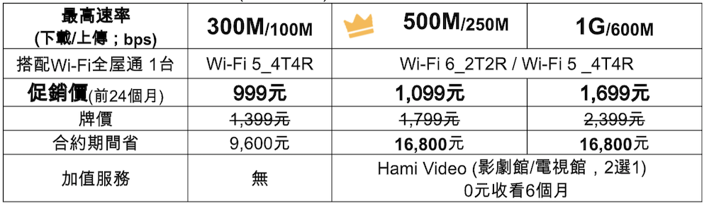 「速在必行」方案 500M/250M 超高速光纖上網,每月只要 1,099 元(原價 1,799 元),合約期間最高省 16,800 元。享有高速、穩定的寬頻上網品質外,還可以免費升級Wi-Fi 6,輕鬆提升全屋訊號涵蓋率,再享 0 元收看 6 個月 Hami Video 影劇館或電視館 (2選1)。