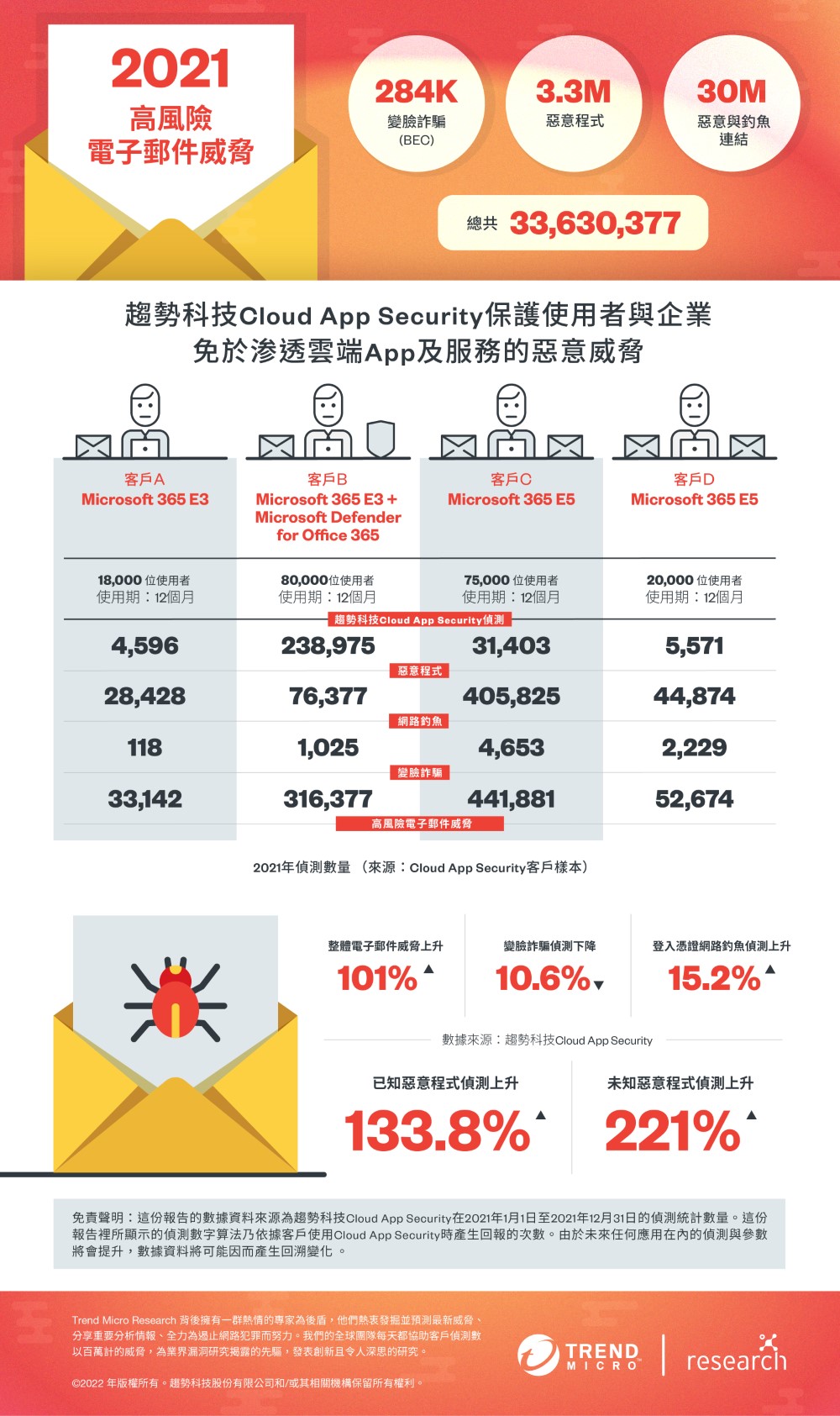 - 偵測並攔截了 330 萬個惡意檔案,已知威脅暴增 134%,未知惡意程式暴增 221%。