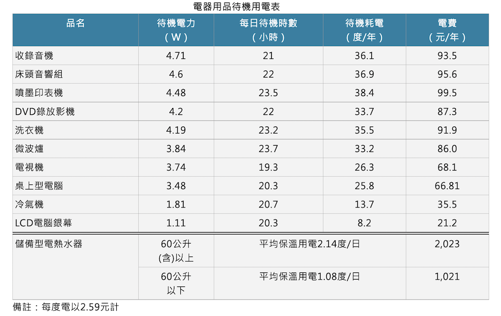 根據經濟部能源局的分享,針對使用「待機電力」的電器而言,長時間不用時,拔除電器插頭是可以省電的。但具有待機電力的電器,如關機還亮著小紅燈的電視、有顯示時間的微波爐,或是關掉電源仍會顯示燭幕的錄放影機、收錄音機或音響、洗衣機、電腦及營幕、會顯示溫度的冷氣機等,或是可使用搖控器開關電力的家電產品,都屬於「待機電力家電」(常見具待機電之家電產品如下)。相對地,非待機電力家電產品使用後或關閉電器總開關,就算沒有拔掉插頭,也不會消耗電量。