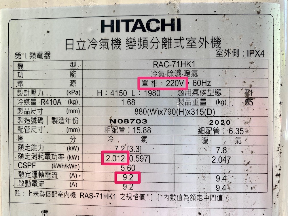 若是家中的變頻分離式室外機身上,顯示的電源為 220V,額定運轉電流為 9.2A 時,它的耗電功率便會是 220 (V) x 9.2 (A) = 2,024 (W) 。