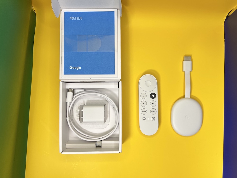 盒裝內包括了Chromecast(支援 Google TV)機器本體、遙控器、充電線、說明書外,還附上兩顆 AAA 的電池給遙控器使用。