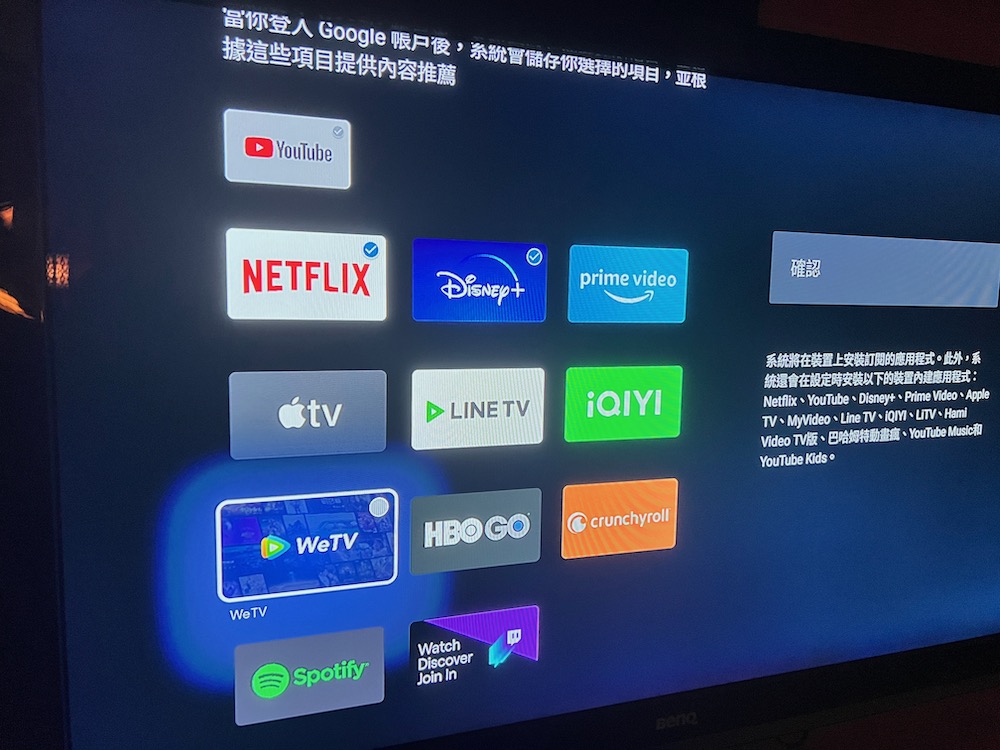 再來的小貼心之一就是台灣版本的 Chromecast(支援 Google TV)已經幫大家準備好 YouTube、Netflix、Disney+、Prime Video、Apple TV、Line TV、iQiyi、weTV、HBO GO 等 app,我們只要點選有在用的影音串流 app 來安裝即可。