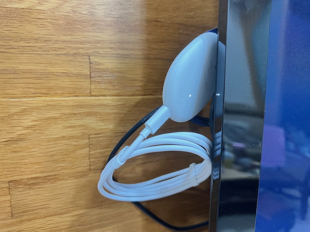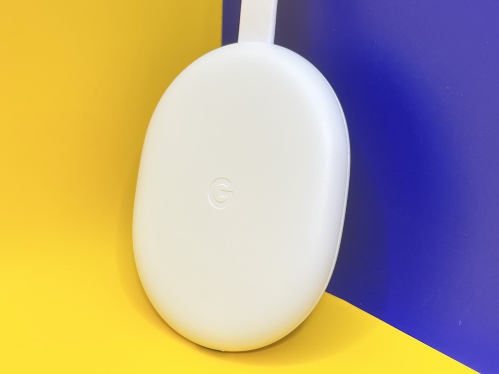 Chromecast(支援 Google TV)本身變的更加橢圓,一端是一條準備與家中電視相接的 HDMI 線,另一端是用來充電的 USB-C 充電連接埠。