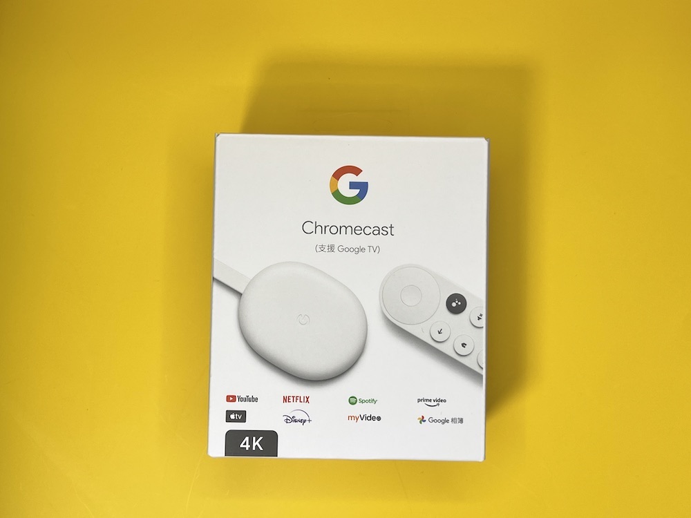 外盒上 Chromecast(支援 Google TV)就有著濃濃的 Google 極簡包裝風格,Chromecast(支援 Google TV)這次台灣只有雪花白單色,而機身本體與遙控器、外盒也都是看起來就很舒服的白色底色,上方僅有紅黃綠藍的 G logo,下方顯示大大的 4K,宣示其支援 4K HDR 特色。