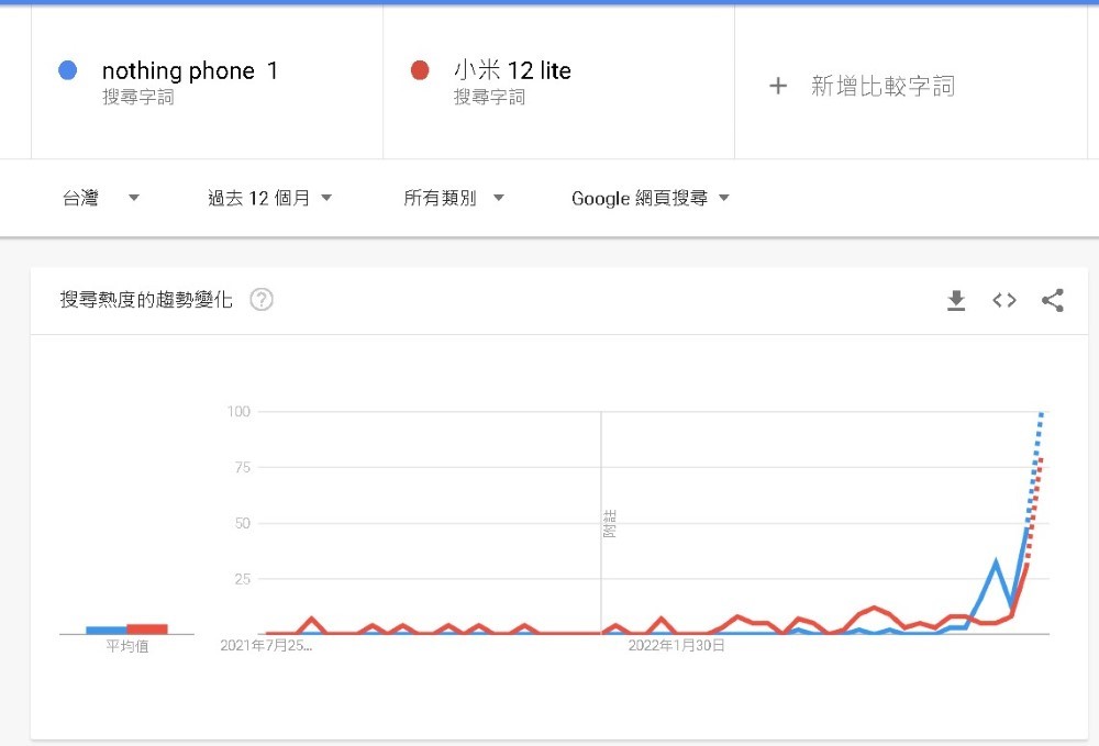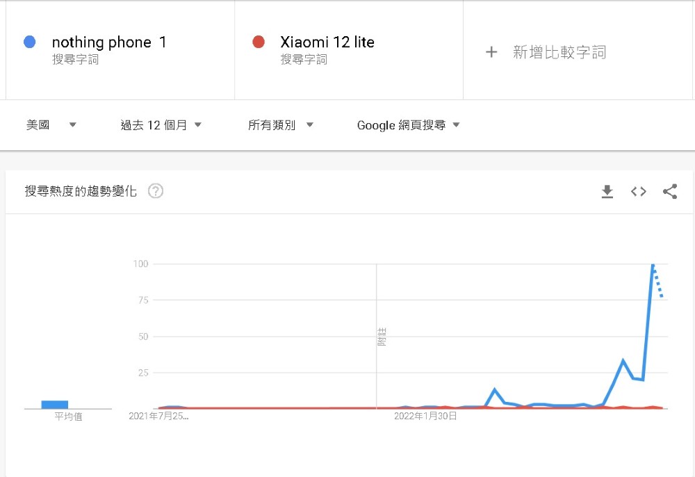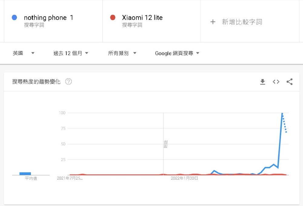 價格方面,Phone (1) 起價新臺幣 13,900 元,與小米 12 Lite 的 13,999 元相差不遠。兩款手機本質上相同,網路聲量卻有天壤之別,無論是英國、美國還是臺灣,Phone (1) 在 Google 搜尋熱度都明顯輾壓小米 12 Lite,原因或許跟 Nothing 行銷策略有關。