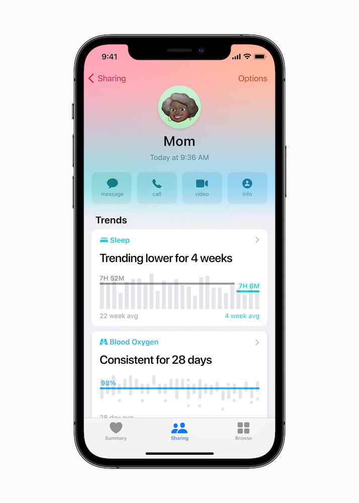 除了文字設定,絕不能少的就是「健康」!父母健康是兒女的最大財富,但工作的繁忙總使子女被迫減少待在爸媽身邊的時間,透過 iPhone 「健康」app 的「分享」功能,在自己的 iPhone 上就能隨時看到爸媽活動的相關紀錄,包含運動、行動能力資料、心率和各項趨勢,有任何的即時更新都能馬上收到通知。