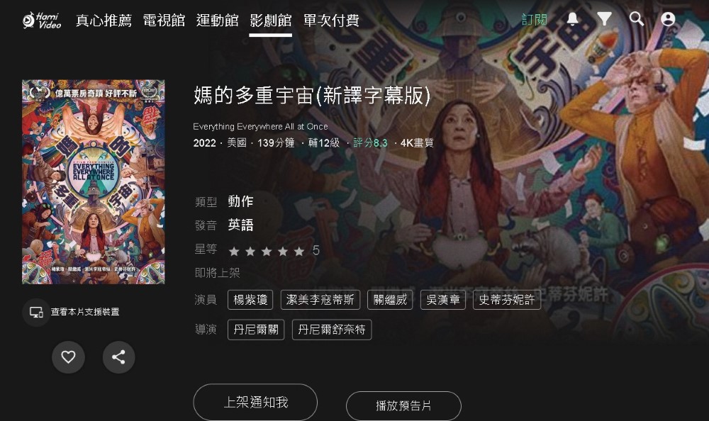 楊紫瓊主演的電影《媽的多重宇宙》(Everything Everywhere All at Once)在國內外獲得良好口碑,如今電影將於 7 月底在 Hami Video 串流平台搶先上架,其餘平台也將陸續上線。另外,片商似乎是要避免先前翻譯爭議擴大,因此串流平將推出的「新譯字幕版」將取代院線版的翻譯字幕。