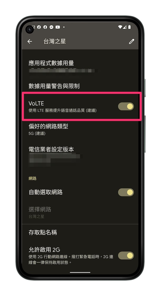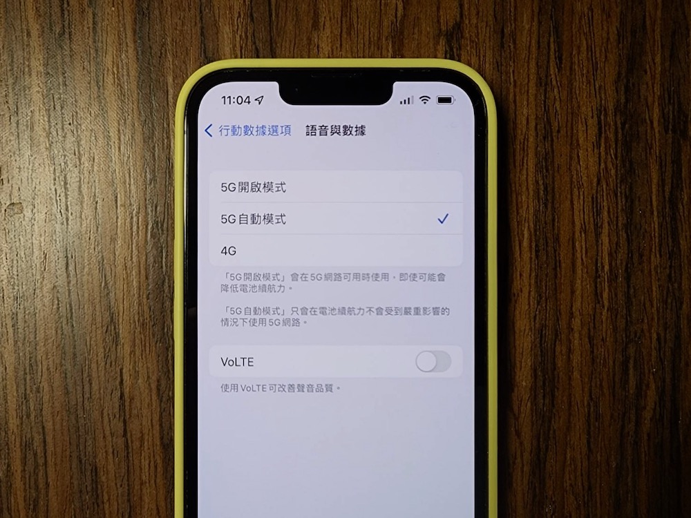 - 前往「設定」>>>「行動服務」>>>「行動數據選項」>>>「語音與數據」,打開 VoLTE。