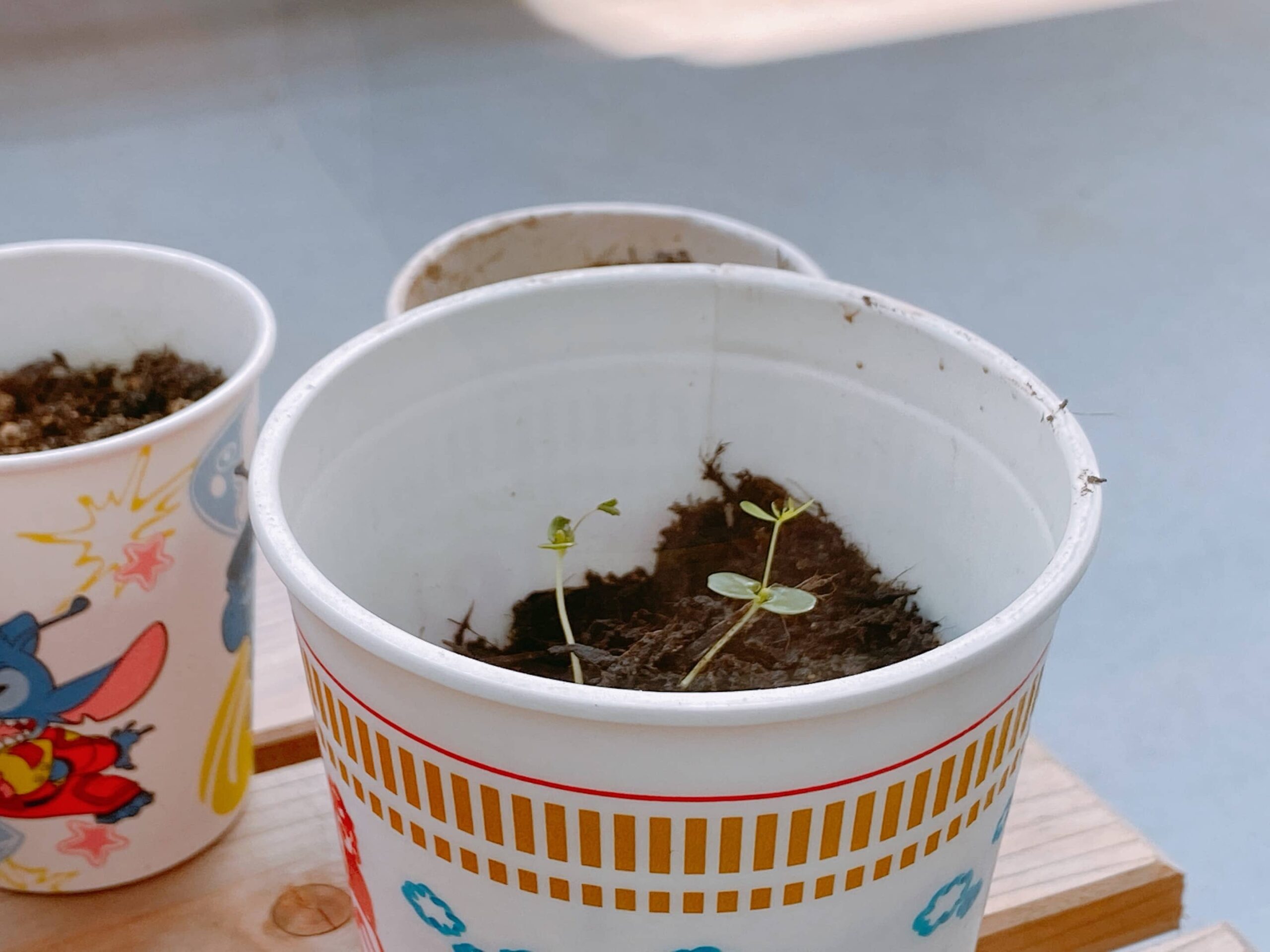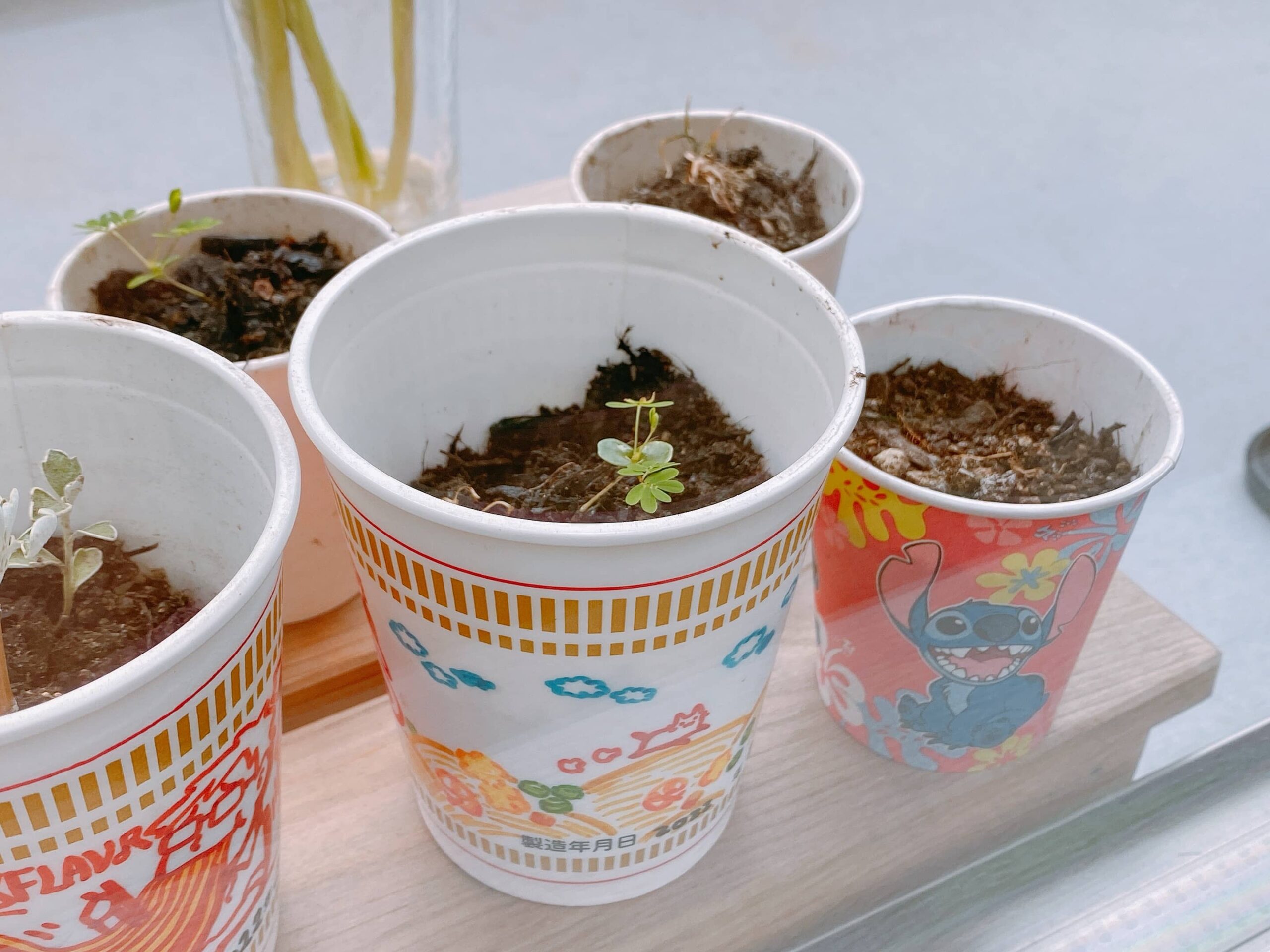 一支小苗被小莓移盆至特製的杯麵碗中!目前看起來有好好地在長大(應該),他現在被摸已經會害羞了!(欣慰)