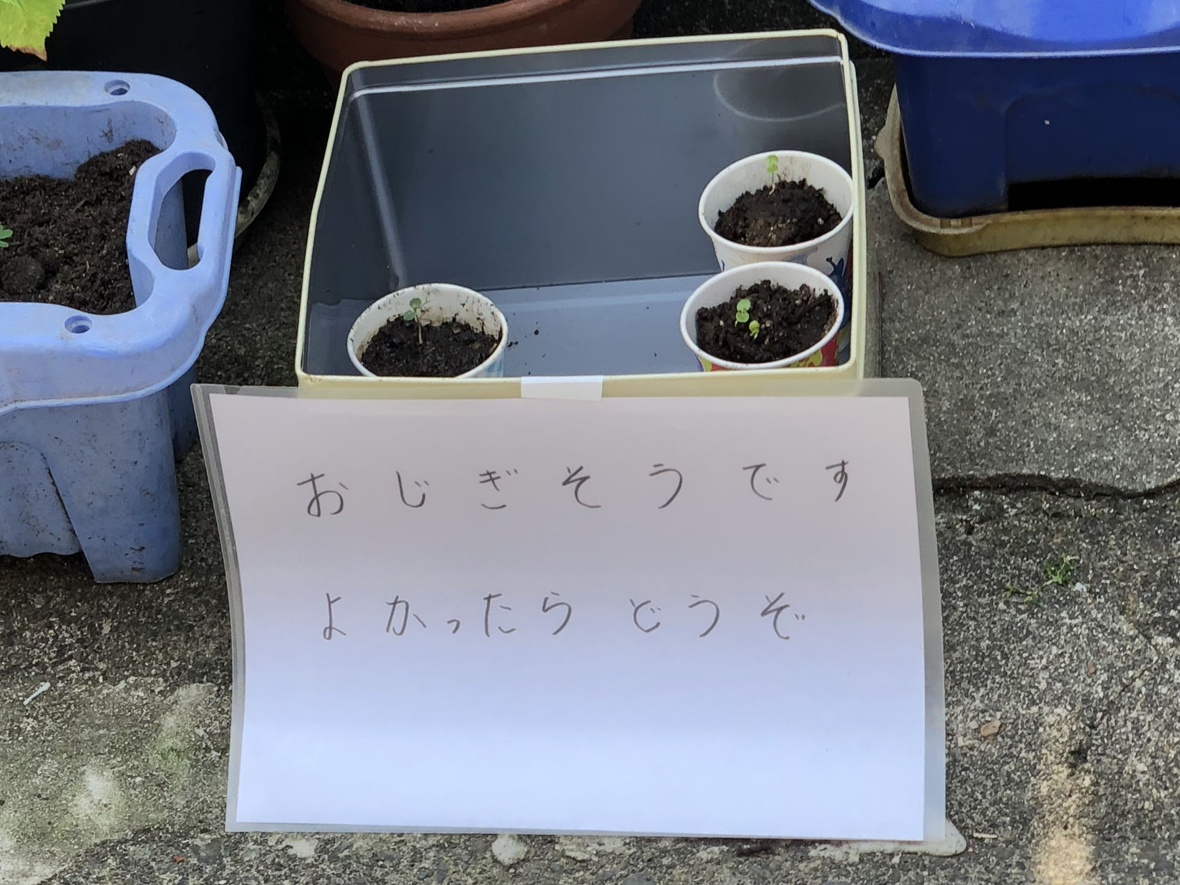 話說,大軒會突然開始種植物,是因為前陣子在路上,看到有戶人家的門口放著一些小小苗,上面寫著「おじぎそうです 良かったらどうぞ」(這是おじぎそう。歡迎拿取。)。