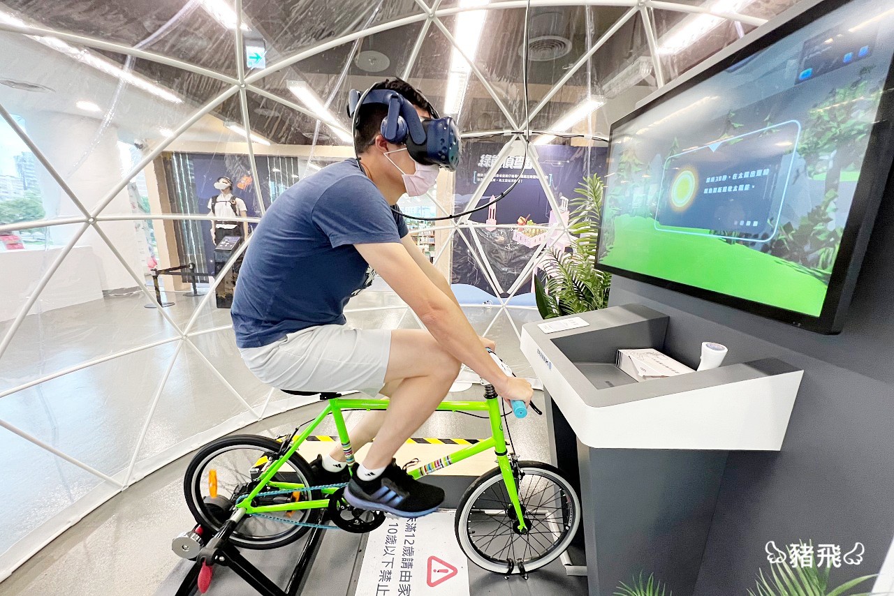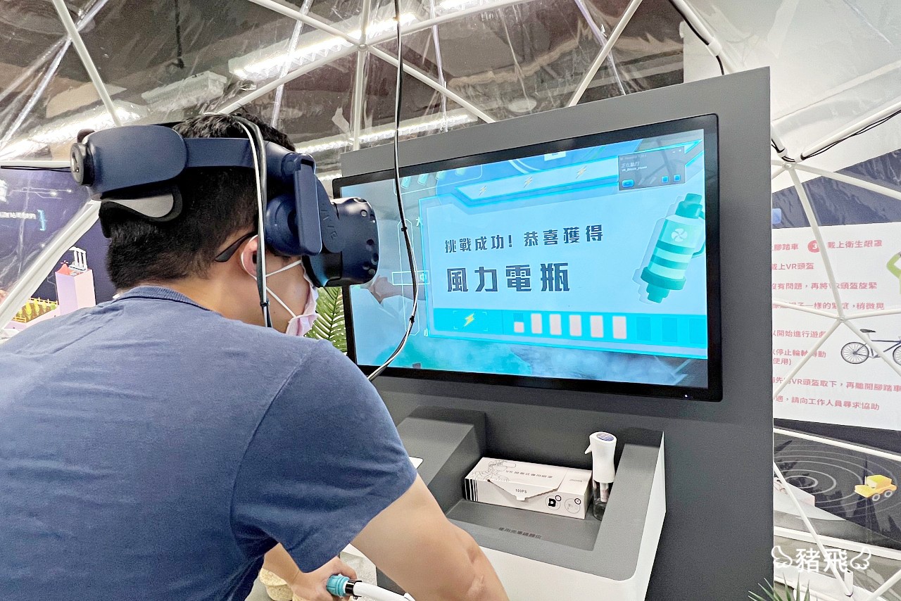 整個展場中最熱門的就是在透明帳篷裡面的VR能量動力車,戴上VR眼鏡,打造沉浸式體驗氛圍。透過踩腳踏車的方式,模擬能源產生過程。在這裡可以了解水力發電、風力發電、太陽能發電的特色,用闖關的方式讓體驗充滿歡樂。