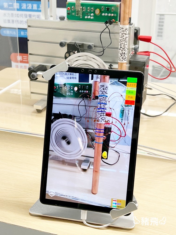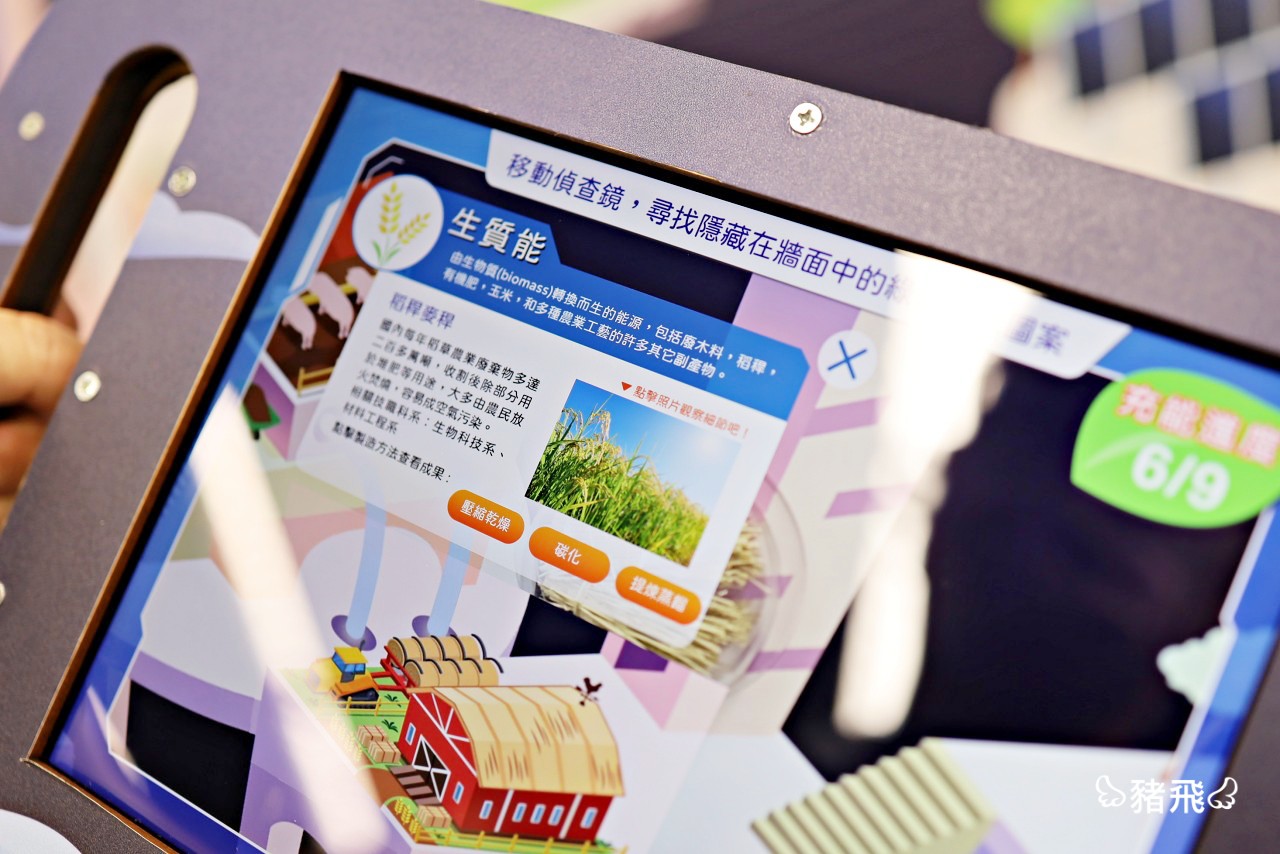 透過平板掃描牆面上的圖案,可以發現綠能如何應用在我們日常生活,你以為很遙遠的綠能,其實已經佈滿生活裡。除了常見的太陽能、風能之外,還有多種生質能。這一區是大朋友小朋友都很感興趣的互動區,透過VR 虛擬實境、AR 擴增實境的互動遊戲,讓我們更認識綠能在生活裡扮演的角色。