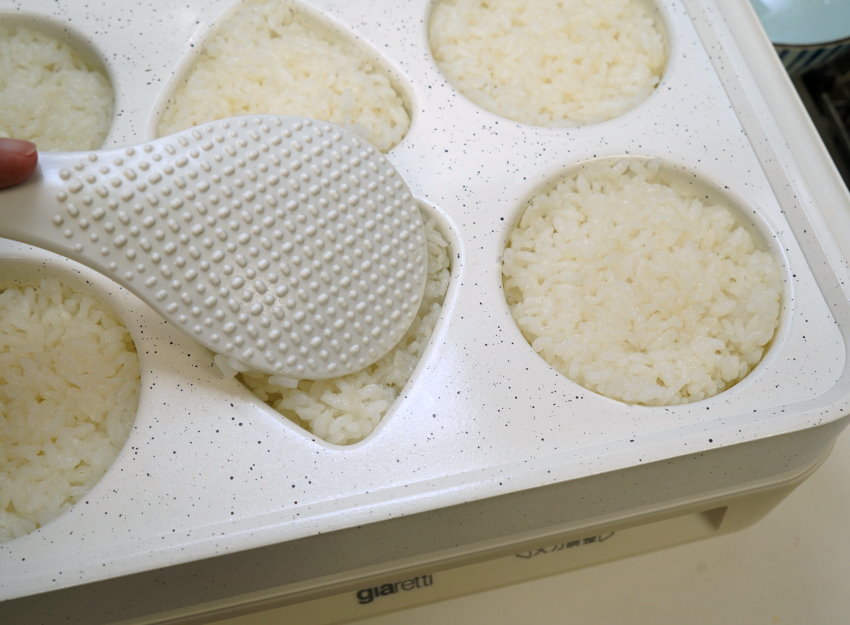 2.將米飯放進模具中,刷上醬油,將兩面煎至微焦就可取出。
