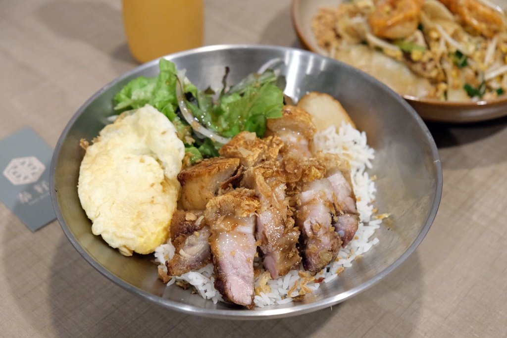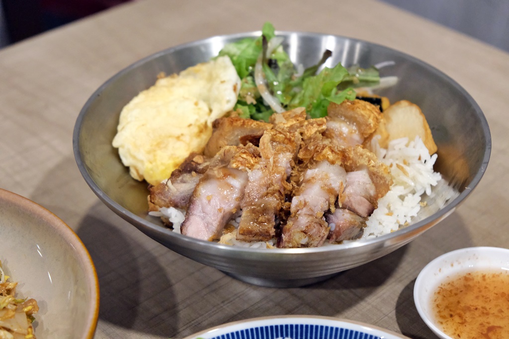 原本想點椰香雞腿飯,結果去點餐路上看到其他桌客人正在吃這個脆皮燒肉看起來很厲害,於是急轉改點這道!凡點椒麻雞、脆皮燒肉、烤雞腿飯都會附荷包蛋和水耕蔬菜,荷包蛋還是誘人的半熟蛋,燒肉的表皮真的超脆,吃起來油脂相當豐富,單吃一兩塊會覺得很不錯,但一個人吃完可能會小膩,比較推薦單點純料多人分享~