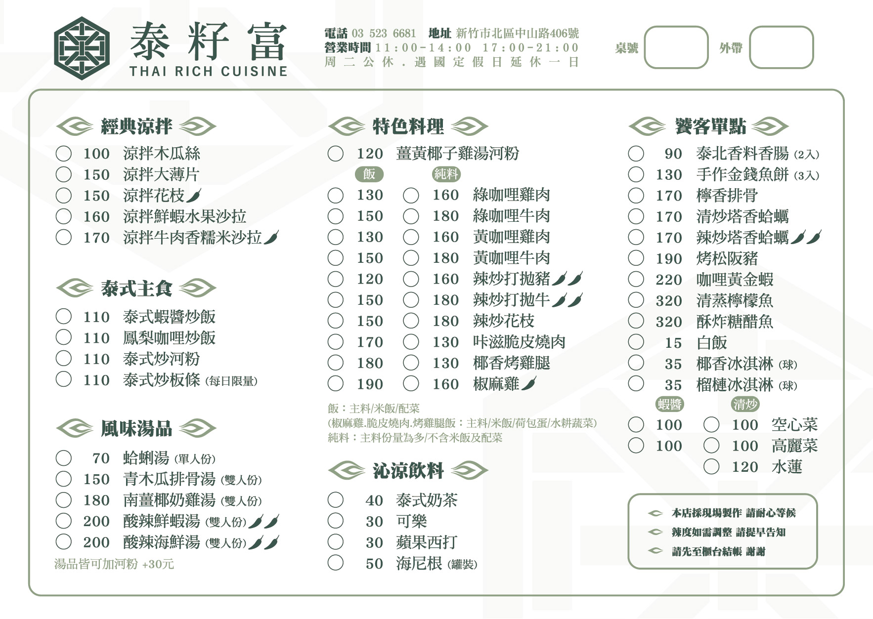 分為經典涼拌、泰式主食、風味湯品、特色料理、單點菜和飲品,餐點採現點現做請耐心等候。