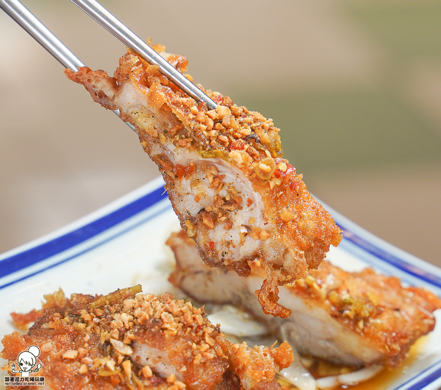 使用無骨雞腿排,油炸酥脆淋上椒麻醬汁