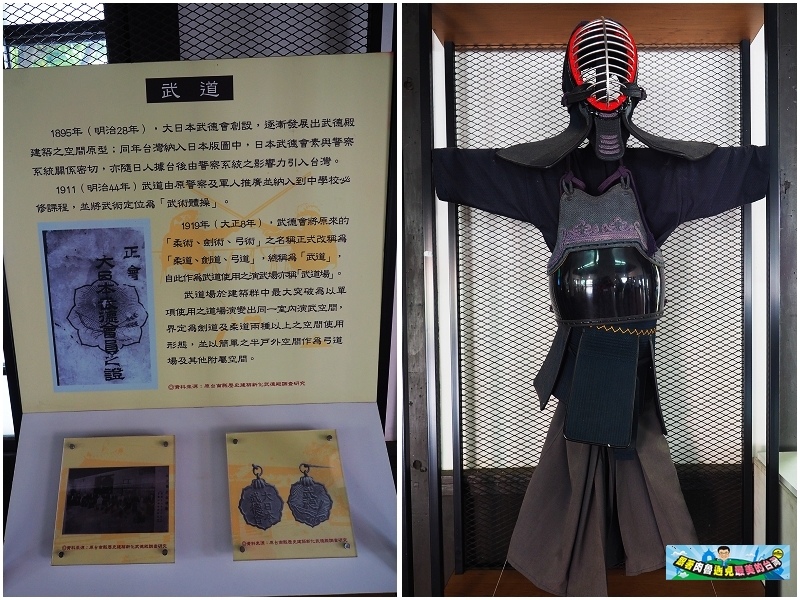 ▲日治時期這裡為劍道及柔道的訓練所,武德殿內目前還展示一套劍道訓練時的裝備,好特別呢。