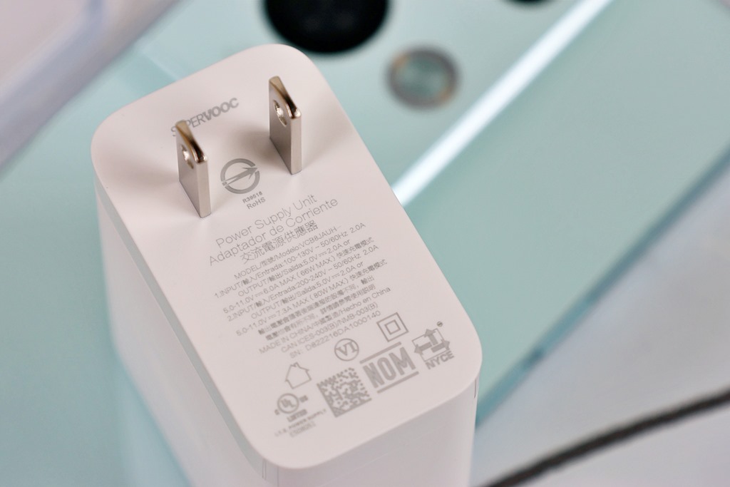 隨包裝附上完整的配件,包含 80W SUPERVOOC 超級閃充充電器、Type-C 充電線、透明保護殼、退卡針等配件,螢幕上也已經貼好保護貼。