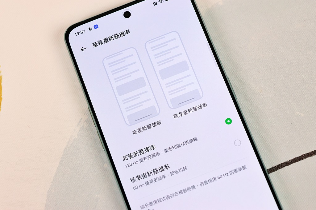 螢幕本身採用 6.7 吋 Full HD+ AMOLED 螢幕,支援 120Hz 螢幕更新率,如果想要更長的續航表現的話,也可以從設定裡選擇 60Hz 螢幕更新率來節省功耗。