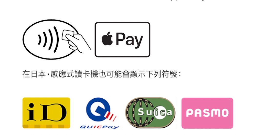 除了日本 QUICPay 和 Visa payWave,Apple Pay 還支援 iD、Suica、PASMO 等電子支付方式。