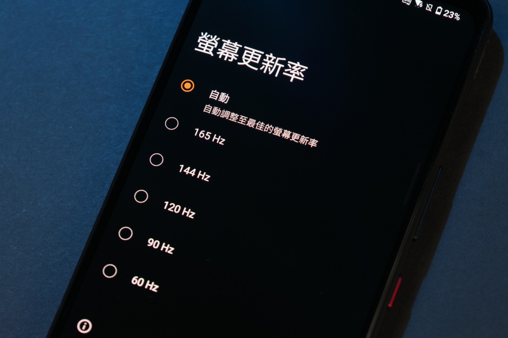 一般旗艦手機螢幕提供 120Hz 更新率選擇,ROG Phone 在前一代就達到了 144Hz 螢幕更新率,來到 ROG Phone 6,更是提供高達 165Hz 的螢幕更新率,瀏覽起來順暢度更高,畫面更不會有殘影,當然,為了平衡功耗表現,從設定中可以手動調整 165Hz、144Hz、120Hz、90Hz、60Hz 等不同螢幕更新率,也可以套用自動螢幕更新率,讓手機自動判斷當下最適合使用者的顯示方式。