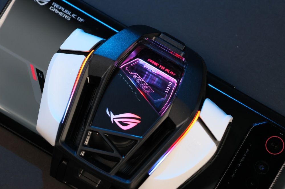 如果要長時間遊戲,更是設計了空氣動力風扇 6 AeroActive Cooler 6,裝上 ROG Phone 6 後,風扇可以直接對著發熱區吹送涼風,可以非常有效的降低機身溫度,讓效能常保高效輸出,而且這個空氣動力風扇 6 還有設有四個按鈕可以強化操控性,這個我們就等等再繼續為大家介紹。