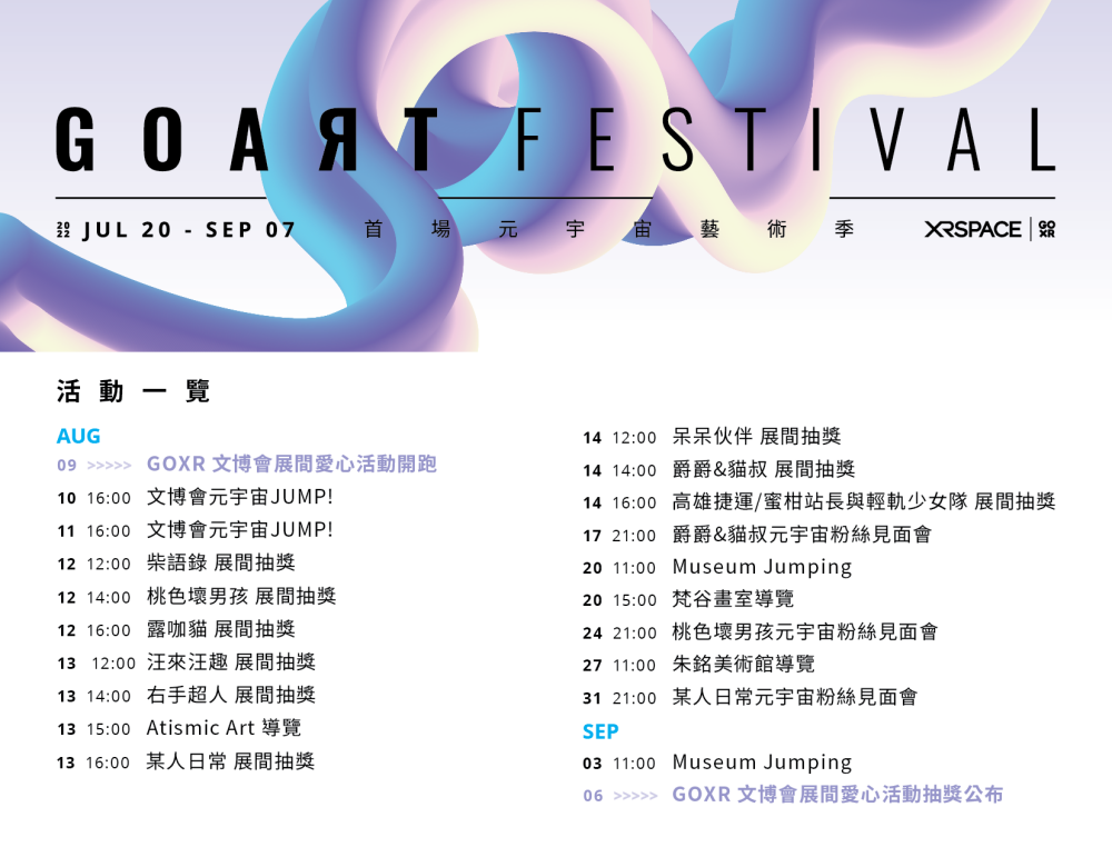 GOXR 為推廣民眾將藝術融入生活,特地舉辦首場元宇宙藝術季「GoArt Festival」,集結 2022 臺灣文博會專區優秀創作者,以及平台自有熱門展覽藝術空間,包含朱銘美術館、梵谷作品展間、 Atismic Gallery 等數位藝文元宇宙空間,將透過系列導覽藝文活動,展現 GOXR 元宇宙多元繽紛的藝文生活面貌。