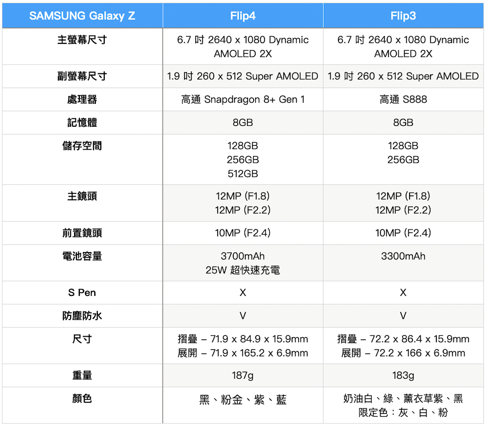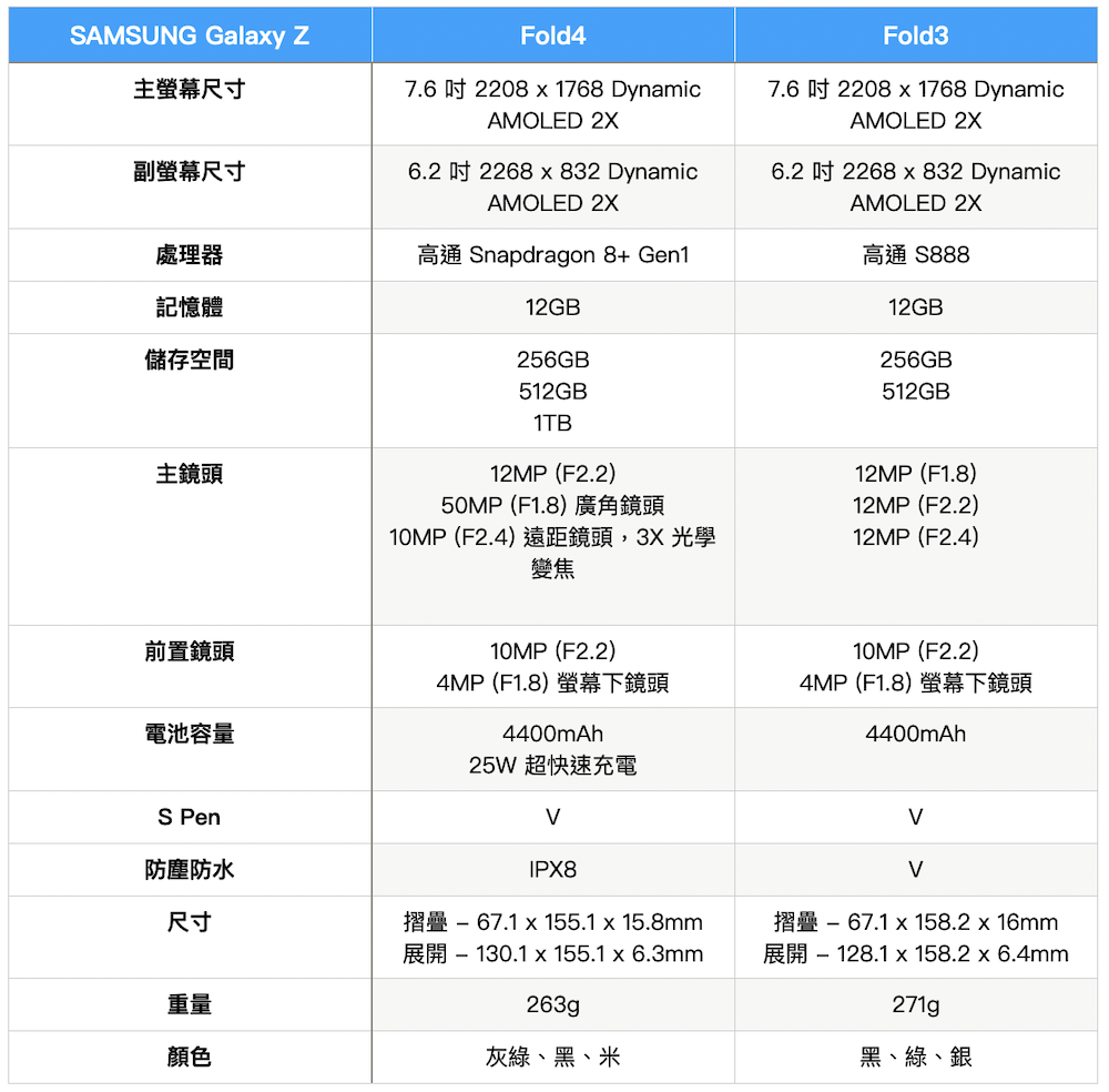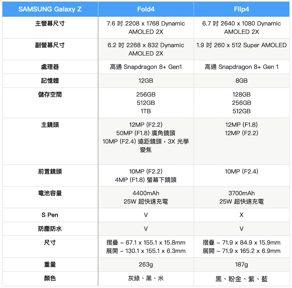 三星 Galaxy Z Fold4 與 Galaxy Z Flip4 規格比較整理 (含前代比較