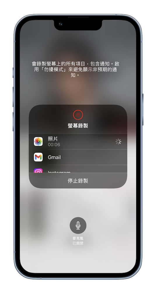 如果第一次沒有開啟麥克風,那麼日後隨時可以在錄影的過程中從長按住螢幕綠影的紅色圓點,就會再次喚出「麥克風」的開關,再次進行開啟或關閉的動作。